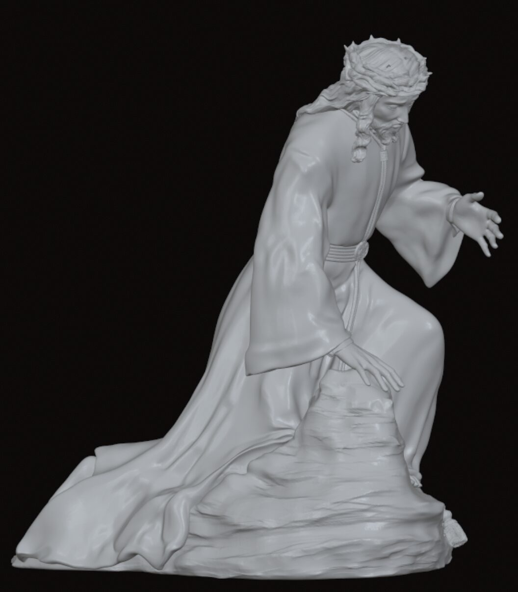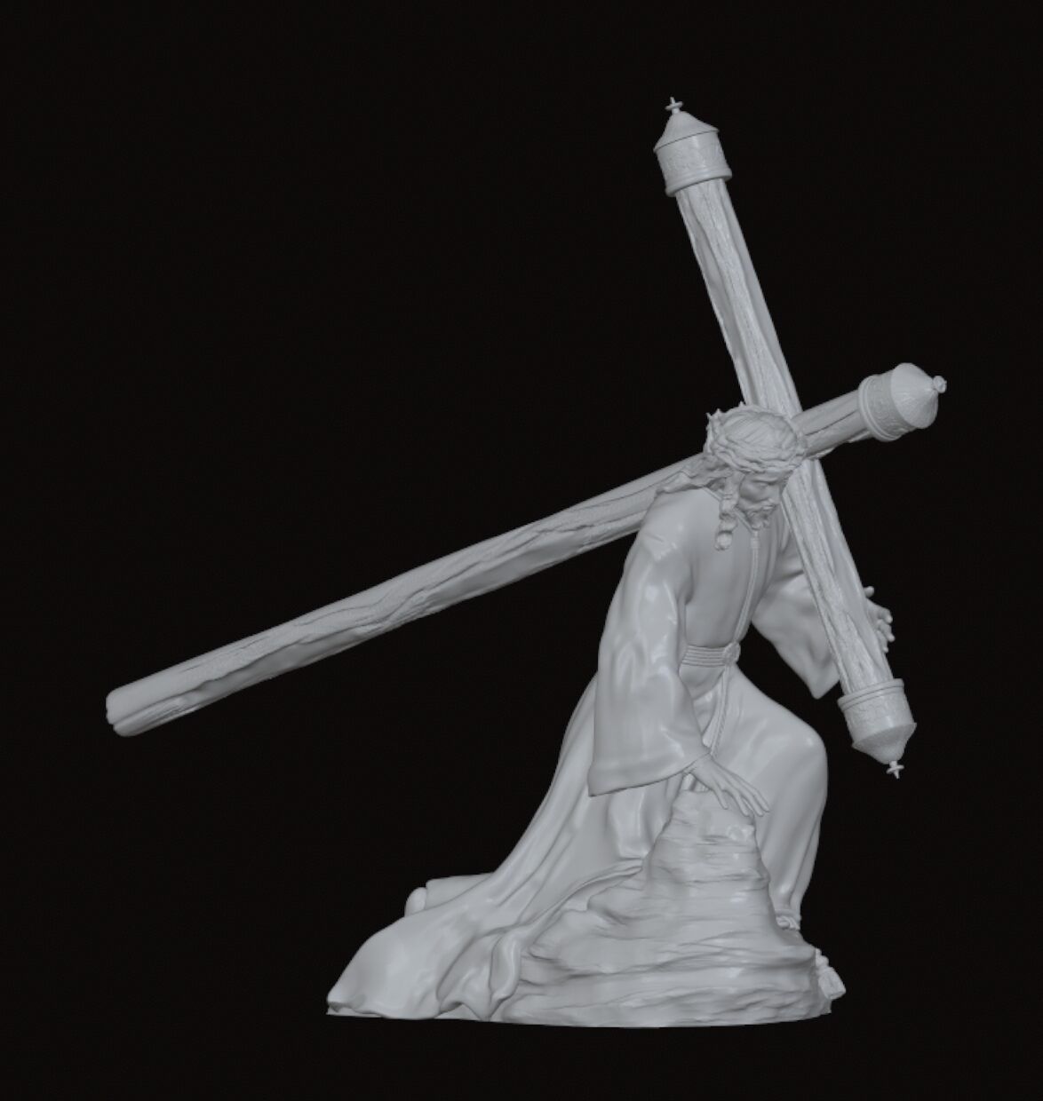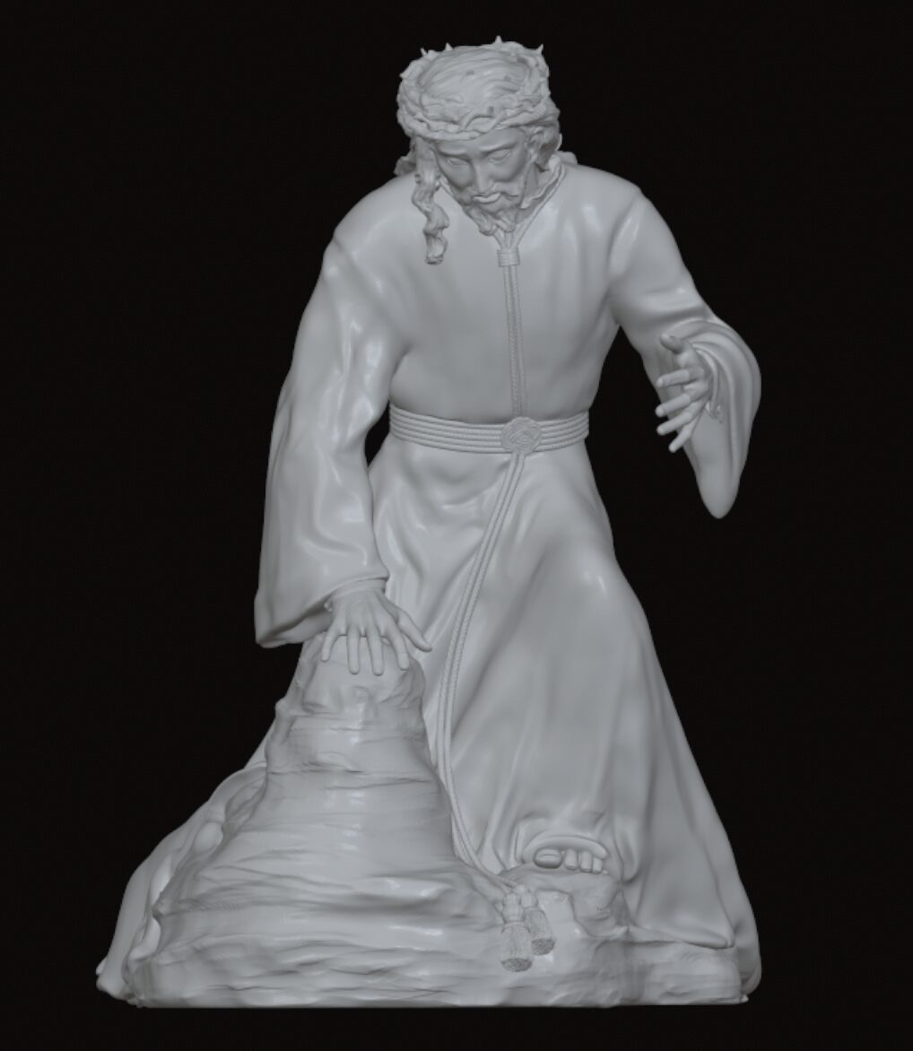 - Iconografía: Jesús Nazareno, caído en tierra, carga con la cruz, reflejando un intenso sufrimiento físico y espiritual, pero con una expresión más melancólica que dramática.